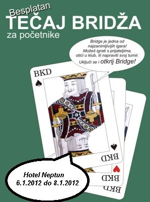 Bridž klub Dubrovnik organizira tečaj učenja bridža za sve građane grada Dubrovnika. Održat će se u hotelu Neptun (Kardinala Stepinca 31) u dvorani Lopud od 6.1.2012 do 8.1.2012.