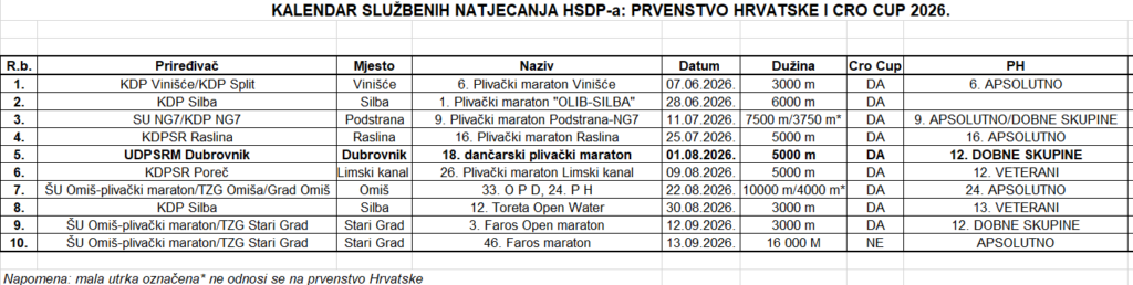18. (punoljetni) Dančarski plivački maraton i Prvenstvo Hrvatske za dobne skupine na 5km, te Cro Cup utrka „Dubrovnik open water swimming 2026.