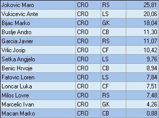 Kao što vidimo, Joković je bio najbolji igrač Hrvatske reprezentacije. Vukičević je preuzeo najviše odgovornosti s lijeve strane otkad se Sukno oprostio od reprezentacije. Bijač je standardno dobar na golu. Bušlje nam je uobičajeno najučinkovitiji bek. Garcia je dosta zakinut na ovom natjecanju jer se nisu bodovale asistencije pa mu je zbog toga učinak slabiji, a ne zbog lošije igre. Vrlić je imao jako dobar učinak za sidruna, Šetka standardan, a rookie Benić očekivano dobar jer je napadački jako opasan kao bek. Fatović je ovo prvenstvo odigrao ispod očekivanja, Lončar malo slabiji od Vrlića. Miloš na svom nivou, a Marcelić ne dobija previše prilika na golu. Macan uobičajeno nema neki napadački učinak pa mu je statistika dosta slaba.