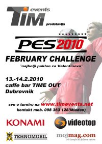 Nakon iznimno uspješnog organiziranog PES Dubrovnik Open-a 27.12., organizatorima, među kojima je i naš Provokator, nije dugo trebalo da opet organiziraju turnir. Ovaj put pod nazivom PES 2010 February challenge koji će se održati 13. i 14.2 u Caffe baru “Time-Out”. Sve informacije o prijavama, pravilima i svemu ostalome pogledajte na www.timevents.net.