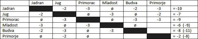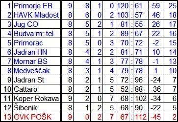 Zagreb 1800 HAVK Mladost – Primorje EB Koper 1800 Rokava Koper – Medveščak Dubrovnik 1800 Jug CO – Šibenik Kotor 1930 Primorac – Mornar BS Budva 1800 Budva m: tel – VA Cattaro Igalo 1800 Jadran HN – Jadran St slobodan: OVK POŠK