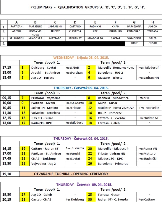 Partizan (Srbija), Arechi (Italija), St. Andreu (Španjolska), Marseille (Francuska), Roma VIS Nova (Italija), Mladost Pančevo (Srbija), Jadran HN (Crna Gora), Trieste (Italija), Mattaro (Španjolska), Cataro (Crna Gora), Crvena Zvezda (Srbija), Jadran Split (Hrvatska), Radnički Kragujevac (Srbija), KPK Korčula (Hrvatska), HAVK Mladost (Hrvatska), Barceloneta (Španolska), Duisburg (Njemačka), CN Barcelona (Španjolska), Primorac (Crna Gora), Vojvodina (Srbija), Terrassa (Španjolska), Galeb (Makarska), te četiri domade momčadi Cavtat, Gusar i VK Jug CO s dvije selekcije.