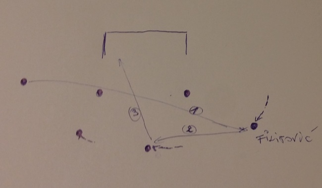 Oba puta lijevo krilo navuče obranu, malo i zavuče prema liniji gola kao na slici. Filipović se izvuče metar prema vanjskome i kad dobije loptu je opasan jer je odličan šuter u dobroj poziciji. A ako se obrana koncentrira na njega proslijedi loptu do desnog vanjskog koji je do tada već na srednjemu i koji na prvu šutira dijagonalno. Ova akcija ne može se odigrati ako su u igri dva ljevaka, Filipovic i Mandic kojega ovaj put nije bilo.