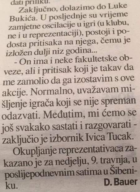 Isto tako, dan ili koji više kasnije opet je imao niz lapsusa pa je tako Buljubašić postao igrač Mornara (trebao bi se vratiti u Jadrana iduće godine), a Vukičević od Ante postao Antonio. Zanimljiviji je pak odlomak koji se tiče Luke Bukića. Eto, i dba kaže da u posljednje vrijeme oscilira u klubu, ali ne i u reprezentaciji. O ovome prvom bi se dalo raspravljati, ali ovo drugo je definitivno točno. Jer Luka Bukić nikad nije ni igrao na reprezentativnom nivou pa tu i nema oscilacija, već jedna duga, četverogodišnja konstanta.