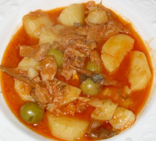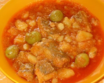 Do tad skuhamo patate u posoljenoj vodi na kocke ali napola (oko 1 kg), tako na pola gotove patate dodamo u teču sa bakalarom i dodamo oko ½ kg zelenih maslina sa picama (iz tegle) i sve skupa kuhamo još pola sata.