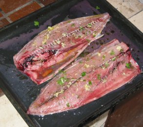 Plava riba ima dosta krvi i tamnog mesa što nije baš ukusno i  treba ga očistiti i oprati,  koža ribe se malo rasiječe nožem da bolje upija začine.