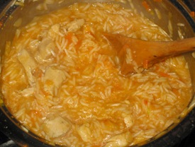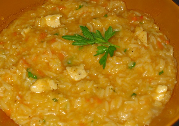 U teći na maslinovom ulju zažutimo glavicu-dvije luka, kad luk dobije zlatnu boju dodamo izgratanu jednu mrkvu i pileća prsa (file- oko 25 dkg) na kockice koje smo začinili sa malo soli, papra i sa ožicom vegete (ja mixam običnu, pikant i malo mediteran). Dodamo i rizi, obično se stavlja jedna puna šaka rizi po čovjeku, u ovom slučaju tri, to možda izgleda malo kad su sirove ali kasnije one dobiju na volumenu.