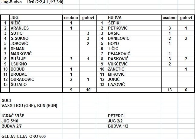 U solidnoj utakmici Jug je dosta teško dobio Budvu. Nakon izjednačene prve četvrtine, krenule su serije 4-0, 0-3 pa 3-0. Jug je odigrao promjenjivo, od odličnih poteza, posebno u obrani, do neshvatljivih grešaka u napadu, a naročito s igračem više. Nižić odličan, s tim da je gol Danilovića iz krila prespavao. Sutić je odigrao hrabro, u trenutcima kad se nitko nije usuđivao pucati Šefiku, zabio je lijepe golove. Pridružio mu se i Sandro Sukno. Joković je odigrao puno lošije nego inače, imao je dosta grešaka. Bušlje je prebrzo i uglavnom nezasluženo dobio 2 osobne, manje je igrao, zabio je lijep gol.