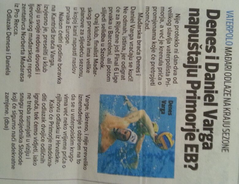 mk: Denes, evo nakon 3 ili 4 godine u Rijeci tvoja prva titula u Primorju, kakav je osjećaj? Denes Varga: Pa nije istina, osvojili smo Jadransku ligu.. mk: Da da, krivo smo se razumjeli, osvojili ste i Jadransku ligu i kup, no mislio sam na prvo prvenstvo osvojeno za Primorje… Denes Varga: Da, u svakom slučaju mislim da je ovo najvažnije što smo osvojili od svih trofeja i vrlo sam sretan s time. Iako nam otvaranje nije bilo najbolje, ne želim podcijeniti Mladost no bilo je loše s naše strane protiv tima s kojim je razlika u kvaliteti 4-5-6 golova u našu korist. Ipak, vrlo vrlo sam sretan s titulom. mk: Da, opet taj lošiji početak, oni vode i sredinom utakmice vi zabijate 4-5 golova u nizu i nakraju pobjeđujete 6 razlike? Denes Varga: Mislim da je to zbog toga što oni imaju mladi tim i imaju puno energije, no naša je klupa jača i imamo puno igrača za zamjene. U drugim poluvremenima svake od ove tri utakmice bila je vidljiva snaga te naše duge klupe i uvijek smo taj dio igre dobivali. mk: Reci nam, postoje neke glasine da je ovo tvoja zadnja utakmica kao igrač Primorja pred domaćim navijačima? Denes Varga: To nije istina, imamo još Final6. mk: Da da, no mislio sam pred našom publikom? Denes Varga: Najvažnije su sad te dvije utakmice u Barceloni i dok to ne završimo ne želim o tome niti razmišljati niti pričati. mk: Bi li želio ostati ovdje i iduće godine? Denes Varga: Da, želio bih. Svi bi željeli ostati ovdje jer ovo je sada najbolji klub na svijetu u svakom pogledu. Ako pogledamo igrače, bazen, publiku, mogućnosti… Ovo je najbolji klub.