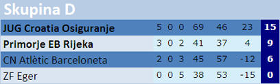 Grupa D je preslika prethodne. Jug kao sigurni prvi odlazi na Kantridu kod sigurno drugog Primorja. Nedavno su Riječani u Gružu uzeli ključni bod s kojim im se otvorilo prvo mjesto u prvom dijelu Jvl-a. Vidjet ćemo hoće li Jugaši uspjeti uzvratiti. U najavi na jug.hr-u apostrofiran je sudački kriterij odnosa beka i centra. Sudit će Koganov iz Azerbajdžana i Naumov iz Rusije.
