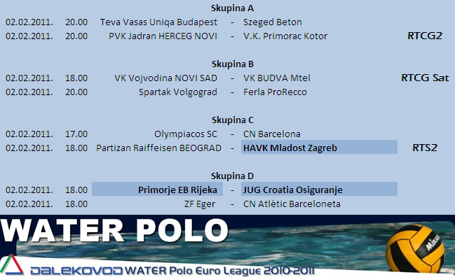 Stigli smo i do posljednjeg kola prvog dijela Eurolige. Nikad do sada se nije dogodilo da su pobjednici svih grupa poznati kolo prije kraja, a ostalo su samo 2 upitnika za drugo mjesto u grupama A i B: Vasas ili Primorac, odnosno Vojvodina ili Budva. Htv se opet sramotno ponio prema vaterpolu pa ne prenose niti hrvatski derbi u Rijeci, a ni sraz velikih rivala Mladosti i Partizana.