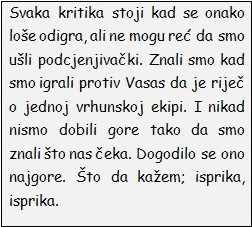 Danče.hr: Je, stvarno je bila odlična utakmica. Tek u zadnje 2–3 minute mali pad tj. Ivović je zabio 2 golčine za produžetke. Ali ako pogledamo lanjsko finale Jadranske lige u Rijeci isto protiv njih (sada bez Ivovića, Zlokovića, Radovića, Jokića itd…), pa taj kup ove godine ili sad Budimpešta. Nekako se ponavljaju uvijek iste stvari, a bilo ih je još nekoliko takvih utakmica.