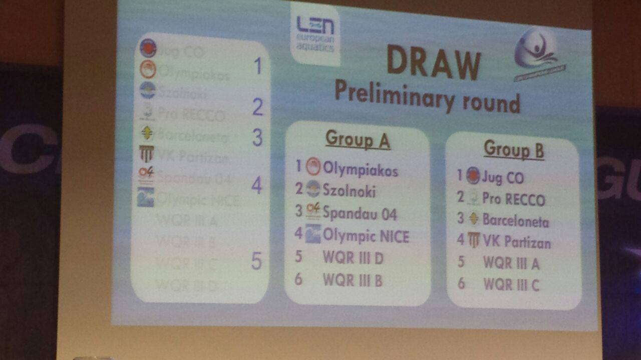 Jug je dakle izbjegao Szolnok koji imaju zagarantiran plasman što je još jedna od besmislica iz LEN-ine produkcije. Oni su bili u paru s Pro Reccom što je i „najpoštenije“, jer realno i oni imaju zagarantiran nastup. Tu je Barceloneta (zadnja 3 prvaka Europe u istoj grupi) i raspadnuti Partizan koji će vrlo vjerojatno bit na debelom začelju ove grupe. Iz kvalifikacija može doći nekoliko dosta dobrih momčadi, od OSC-a, Verone, Brescie, Egera do Jadrana HN-a eventualno i Primorja.