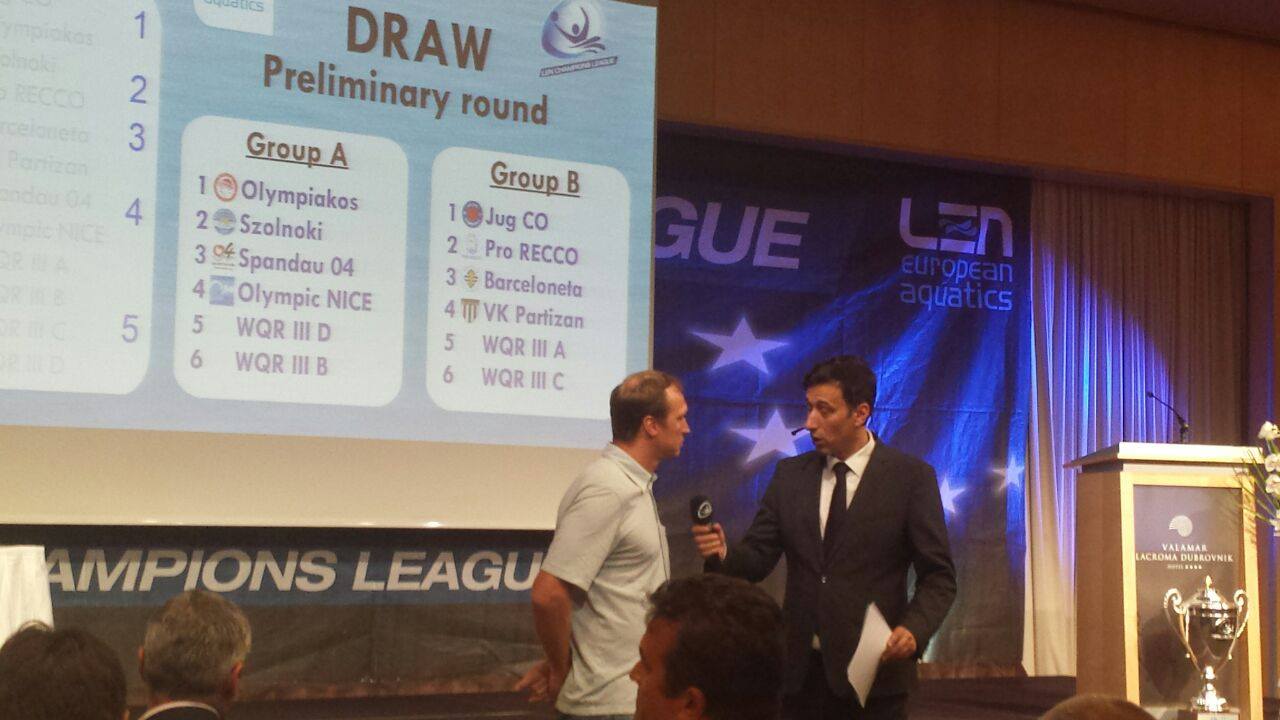 Prvo su dakle ždrijebane grupe Lige prvaka. 8 klubova koji imaju direktan plasman na osnovu ugovora s LEN-om podijeljeno je u 4 jakosne grupe. I da već tu ne bude sve jednostavno Birri je u treću grupu stavio jednu momčad, a u četvrtu 3?! Jer ove tri nisu bile na Final6-u lani. Ali i bez toga je mogao odrediti ko je od njih u prednosti i staviti Partizan u jakosnu grupu 3. Na kraju grupe izgledaju kao na fotografiji: