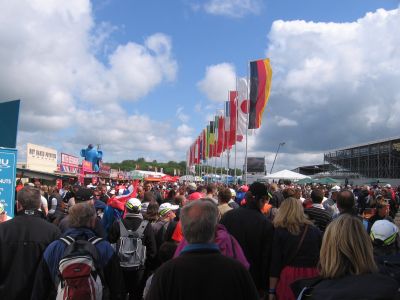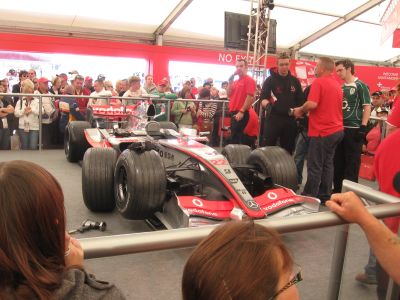 Glavni ulaz je kod startno-ciljne ravnine, i golema gužva vlada oko staze. Bezbroj štandova za hranu i piće, svi puni. Raznolik izbor hrane, ne samo fish&chips i hamburgeri, po zadovoljavajućim cijenama. Velika piva je recimo 3.5 funte, dok sam u barci plaćo istu 8,5 e (najskuplje u život, :tužni smajli: ). Masovno se piva loče, pa vidiš masu pijanih ljudi kako teturaju, leže, spavaju , a vode dijecu sa sobom 🙂 . Oko staze ima masu trkaćih i serijskih porschea, lotusa, ferrarija koji se nude za vozit po stazi, u neke ‘slobodne’ dane. Kad se prođu ti štandovi, ulazi se u ‘ F1 village‘. Tu su smješteni službeni ‘mrčndajz’ štandovi od timova, službene F 1 butige, silverstone butiga, bridgestone štand… Npr. na mclarenovom štandu je izložen njihov bolid na kojem je natjecanje u mijenjanju guma i safety car, na toyotinom možeš sjest u ‘bolid’ i vozit utrku na simulatoru…