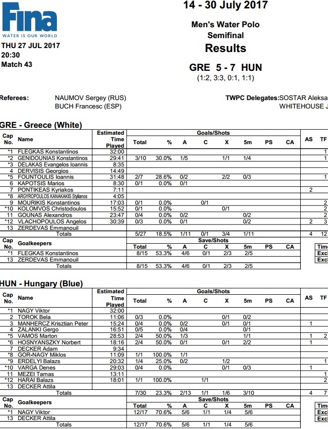 Grčka – Mađarska 5:7 (1:2) (3:3) (0:1) (1:1)