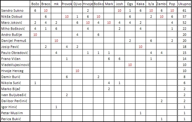 Tako da je pobjednik do posljednjeg trenutka bio krajnje neizvjestan, a svakome od njih trojice 10 bodova je nosilo sigurnu pobjedu bez obzira na ostatak poretka. Ispod možete pogledati kao je Pop odlučio. Zanimljivo je da mu se izbor gotovo u potpunosti poklapa (osim 4. pozicije) sa Bracovim koji je tako i ovu godinu „pogodio“ pobjednika. Popova lista: