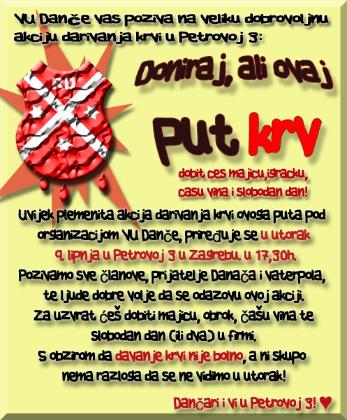 VU Danče vas poziva na veliku dobrovoljnu akciju darivanja krvi u Petrovoj 3: “Doniraj, ali ovaj put krv!”. Uvijek plemenita akcija darivanja krvi ovoga puta pod organizacijom VU Danče, priređuje se u utorak 9. lipnja u Petrovoj 3 u Zagrebu. u 17,30h.