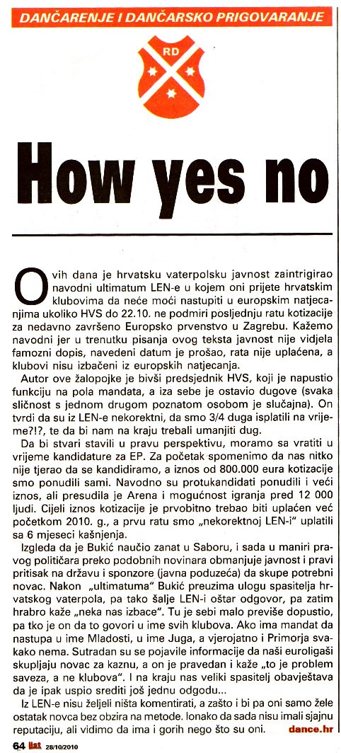 “LEN je zaista poslala dopis u kojem je upozorila HVS na neisplaćeno dugovanje, a sankcije koje ste spomenuli, bile su u kontekstu pojašnjenja što bi se eventualno moglo dogoditi ukoliko se ne uspijemo dogovoriti, odnosno ako HVS ne isplati dugovanje. O sankcijama, odnosno vrsti sankcija na odboru LEN-e, nitko nikad nije razgovarao tako da su priče o suspenziji hrvatskih klubova obična špekulacija.”