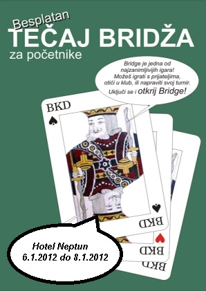 Bridž klub Dubrovnik organizira tečaj učenja bridža za sve građane grada Dubrovnika. Održat će se u hotelu Neptun (Kardinala Stepinca 31) u dvorani Lopud od 6.1.2012 do 8.1.2012.